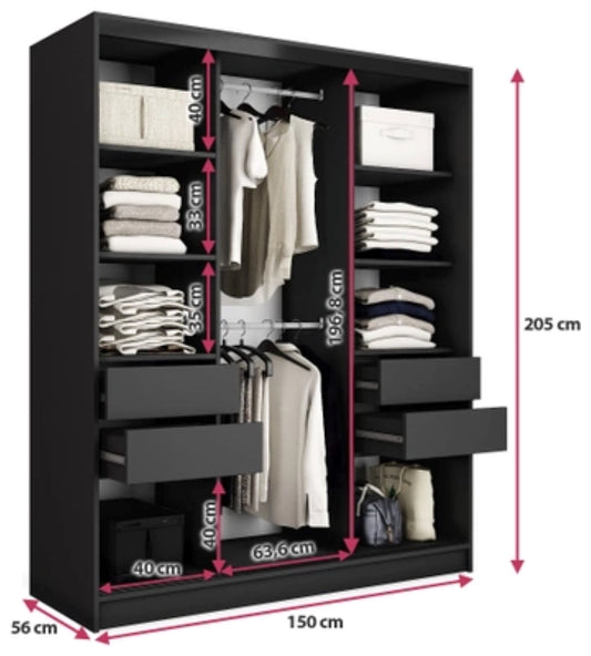 ANEYA Mirror - 3 Sliding Door Wardrobe With Drawers Shelves 2 Rail, Mirror, Black Body 3 Colour Front width 150 cmRegular price £785.00Regular priceUnit price / per-