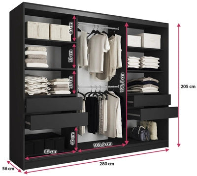 ANEYA 2 - A three-door sliding wardrobe is a practical and stylish solution for your home. Thanks to its solid construction and high-quality materials, the wardrobe ensures durability for years. Sliding doors allow easy access to all parts of the wardrobe, and internal shelves and rods allow for organized storage of clothes and accessories. Perfect for a bedroom, hall or dressing room, the wardrobe helps you make the most of the space while adding elegance and modernity to the interior.