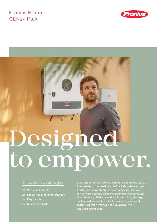 Sustainable, reliable, future-proof: using our Fronius GEN24 Plus inverter as the heart of a photovoltaic system lets you flexibly and economically produce energy yourself. You can connect a battery system to the hybrid inverter to use the solar energy that you produce for electricity, heating, cooling, and emobility. Full solar power for your private energy revolution