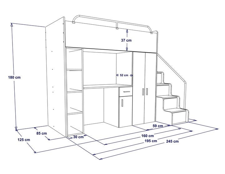 We have used such technical solutions so that during assembly the customer decides on the arrangement of the set, i.e. you yourself choose on which side you will mount the ladder, wardrobe and desk.